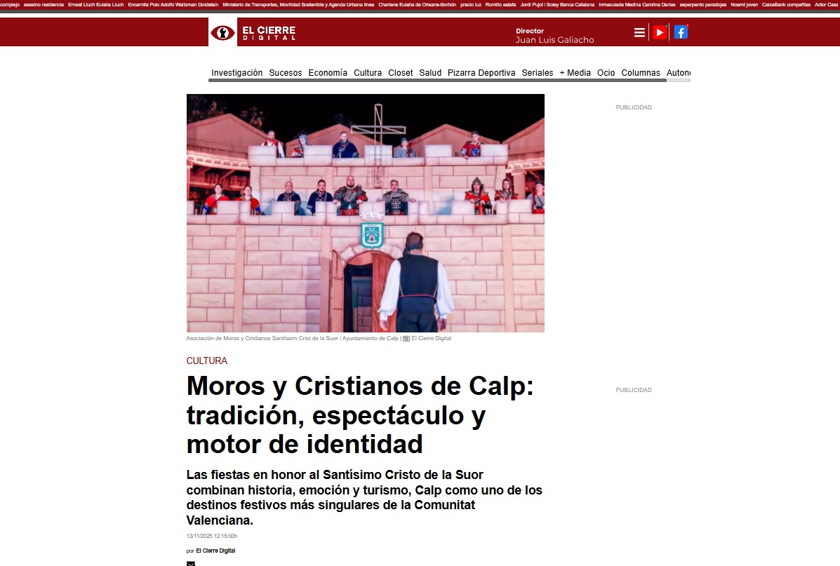 26ecc316665fc6a94e9baa732c96af74 difusioncomunicacion wrote a new post https://morosycristianos.calpe.es/?p=2677 Sun, 16 Nov 2025 12:39:09 +0100 Calp, a destination of history and celebration: the Moors and Christians festival draws thousands of visitors from across Spain.The Moors and Christians festivities in Calp, held in honor of the Santíssim Crist de la Suor and officially recognized as an Autonomous […]